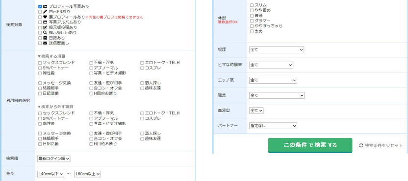 PCMAXでは、プロフィール検索も非常に細かい項目で指定して検索できるのですが、