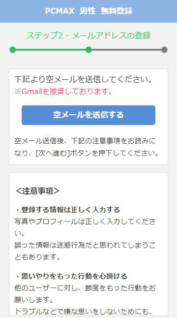 こんな画面が出てきたら、空メール送信で登録が完了します。画面のようにPCMAXではGmailを推奨しています。フリーメールで登録できるのはありがたいですね。