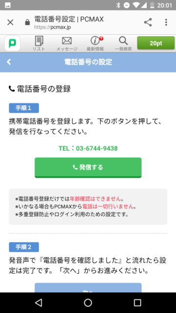 指定された番号に電話をかけることによって認証します。電話をかけるといっても、オペレーターが出てくるなどということはありません。電話番号を確認しましたと自動音声で流れるだけなので、意外とあっけなく完了します。