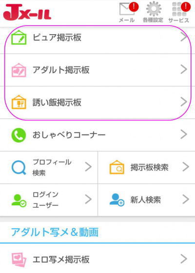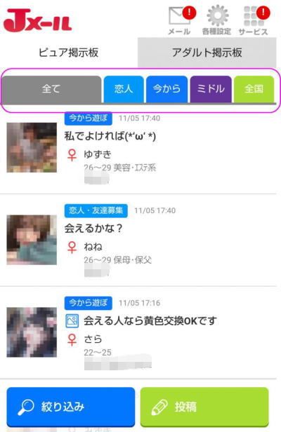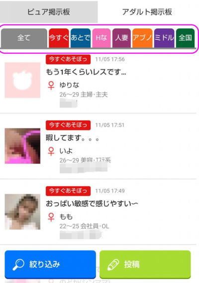 ここで、ピュア掲示板を選択すると、恋人・友達募集、今から遊ぼ、ミドルエイジと分かれていますが