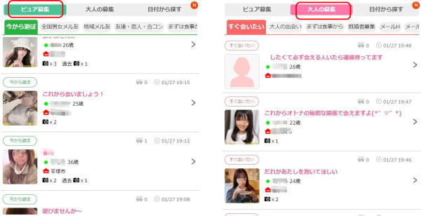 下の画像は、左がピュア募集、右が大人の募集ですが、それぞれ細かく分かれているのが分かると思います。