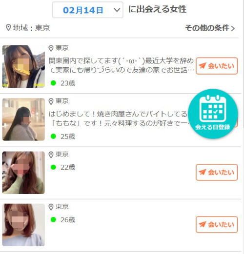 これはログインしてるとここに表示されやすくなるみたいなんで、ここの女の子狙ってメッセージ送ると早いかもしれませんね。
