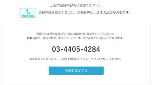 指定された番号に電話をかけることによって認証します。電話をかけるといっても、オペレーターが出てくるなどということはありません。電話番号を確認しましたと自動音声で流れるだけなので、意外とあっけなく完了します。