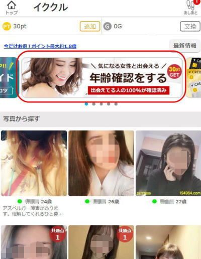また、イククルではログインするとトップページにいきなり女の子がドーンと表示されています。