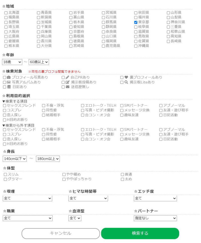 プロフィール検索を使えば、相手の居住地、年齢、身長、スタイル、職業など細かく条件を指定して相手を探すこともできます。